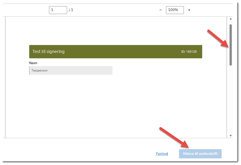 - Det er vigtigt, du scroller helt ned i bunden af den. Ellers bliver knappen "Videre til underskrift" ikke aktiv, og du kan ikke underskrive.