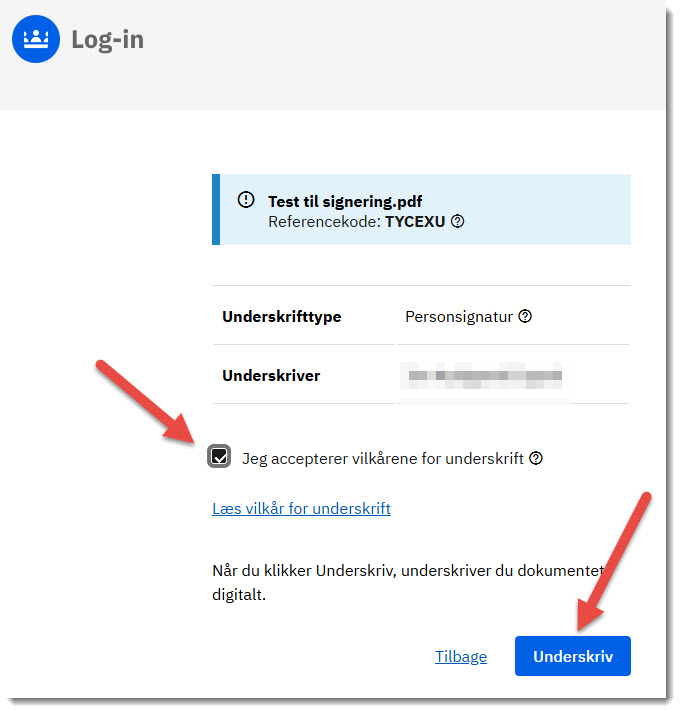 - Du skal nu acceptere vilkårene for underskriften. Sæt flueben i boksen.