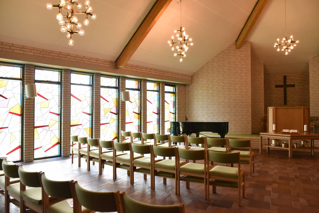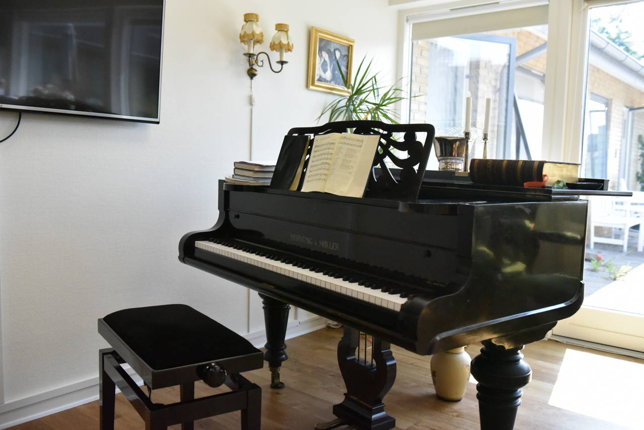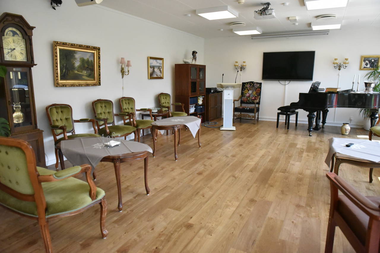 Vi har et stort fællesrum, hvor der bl.a. er klaver, TV, en talerstol med mikrofon, borde og stole.
